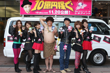 本日はアダモちゃんも駆けつけて行った"バズーカ出陣式"で始まった渋谷ジャックでは、公開を記念して映画から生み出された「ナニティー7Oハート」の商品を実際に販売している渋谷の6店舗と映画が公開される映画館(「渋谷シネクイント」)の計7ヶ所をテリー伊藤とハローワークスらが各所を回りました。
